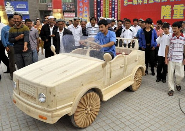 A metà strada fra un'auto e un mobile, questa strana macchina è stata appena presentata al Festival Internazionale del Turismo di Kashgar, una città della provincia autonoma dello Xinjiang, in Cina che si trova presso un'oasi del deserto di Taklamakan. L'auto di legno è stata la vera regina della manifestazione: ha un motore elettrico ed è tutta di legno massello. Per costruirla sono stati spesi 15 mila yuan (1600 euro) e un anno di lavoro da parte di alcuni falegnami locali appassionati di auto d'epoca.