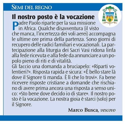Una semplice nota: oggi "La Prealpina" ha pubblicato un articolo. Non mi esprimo sul contenuto, ma vorrei dire che *non ne ero a conoscenza e che sono state messe tra virgolette come se fossero mie* (e quindi si potrebbe pensare che le abbia pronunciate io in una intervista) delle espressioni che si possono ritrovare in diversi materiali messi a disposizione per la riflessione nelle nostre parrocchie. Il tema resta importante e urgente. _Marco Paleari_